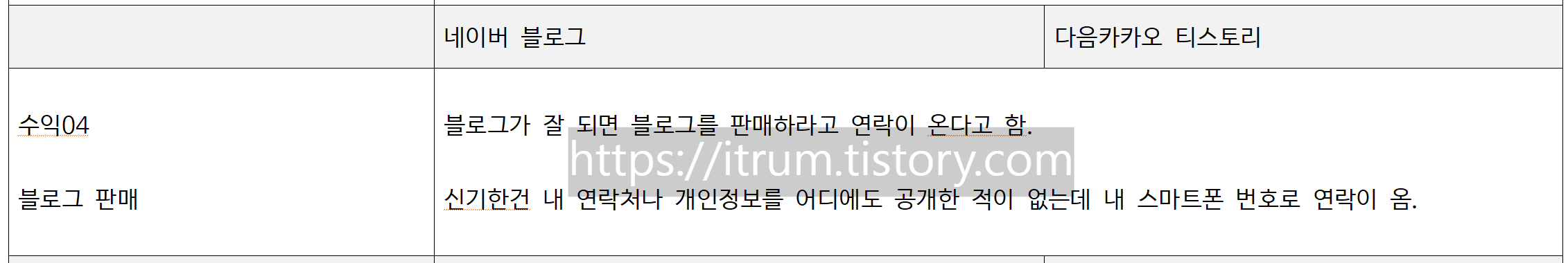 블로그 비교 표(문서)를 만든 이유는, 최근에 지인이 블로그를 시작한다고 하여 특징을 비교하는 표 문서를 만들었어요.