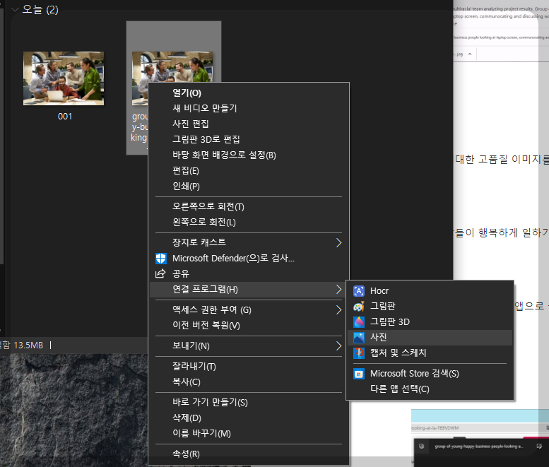 일반적으로 이미지를 더블클릭하면 사진앱으로 실행되지만, 만약 다른 앱(프로그램)으로 실행된다면 우클릭으로 실행합니다.