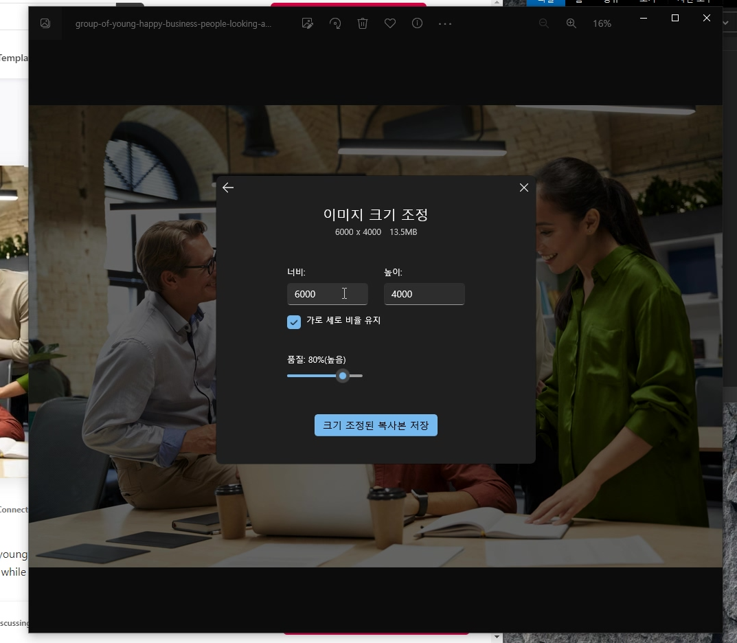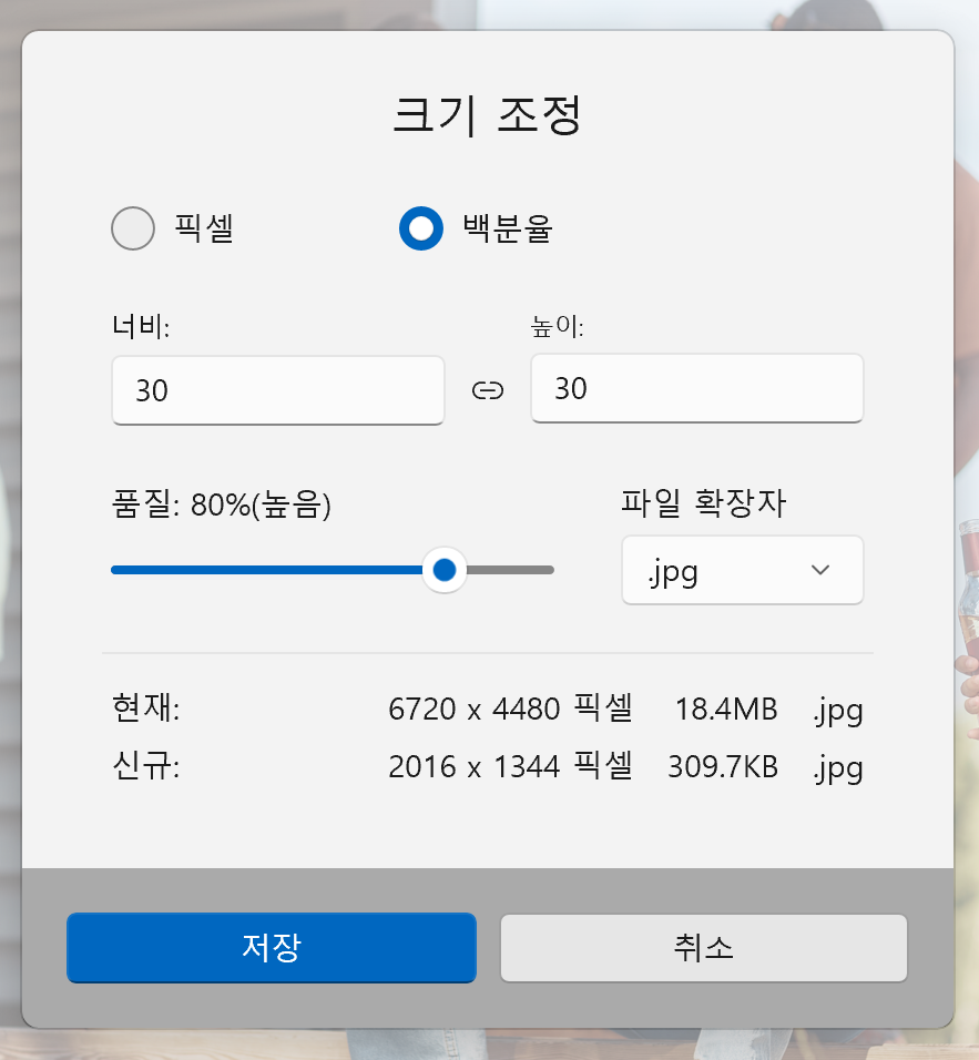 이런 식으로 윈도우10에서 '이미지 품질, 이미지 크기, 사진 비율 변경 유지'가 가능합니다.
