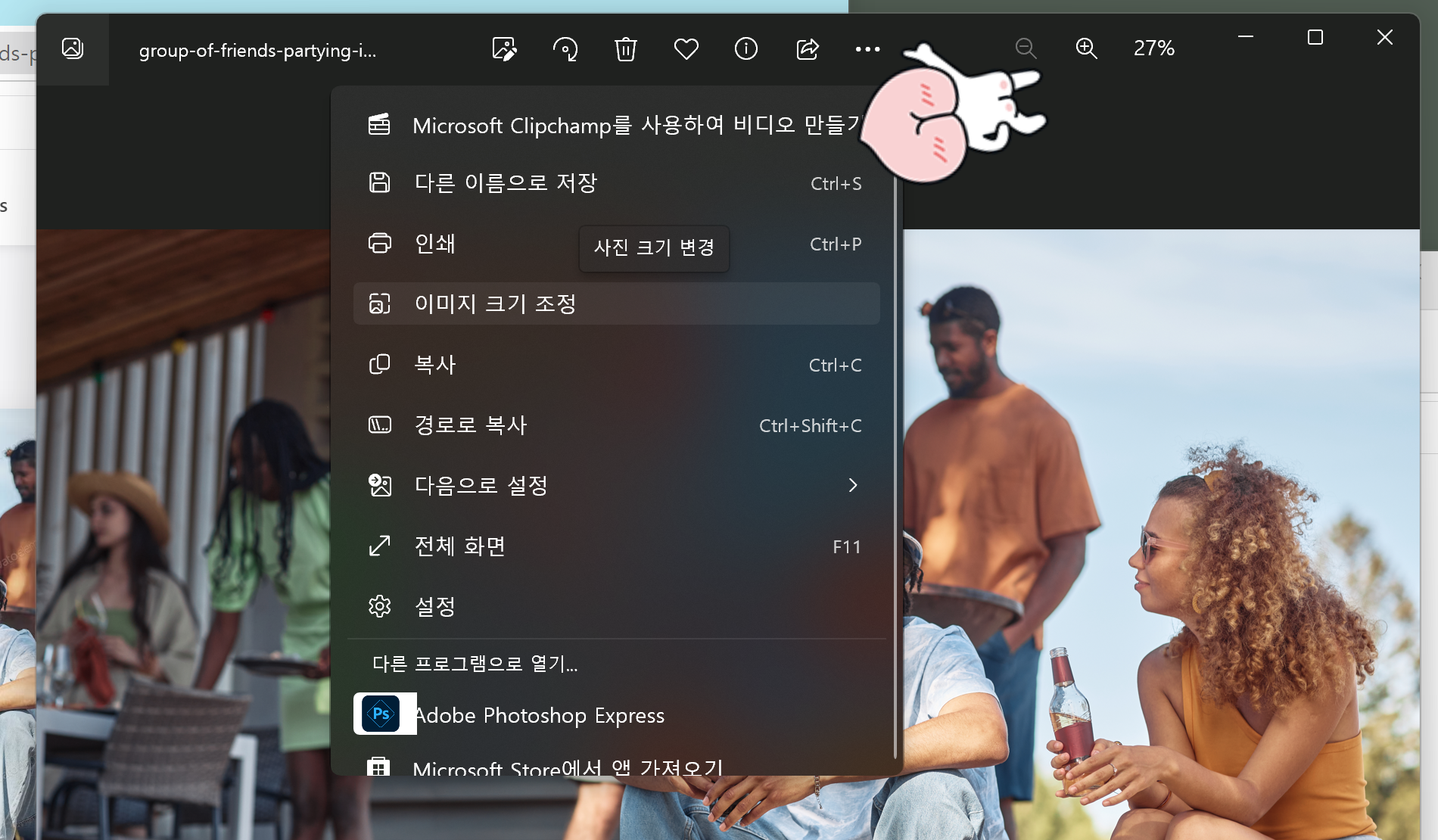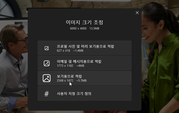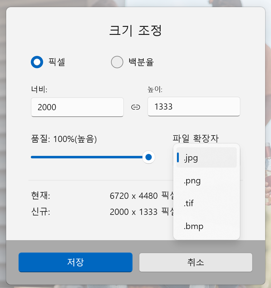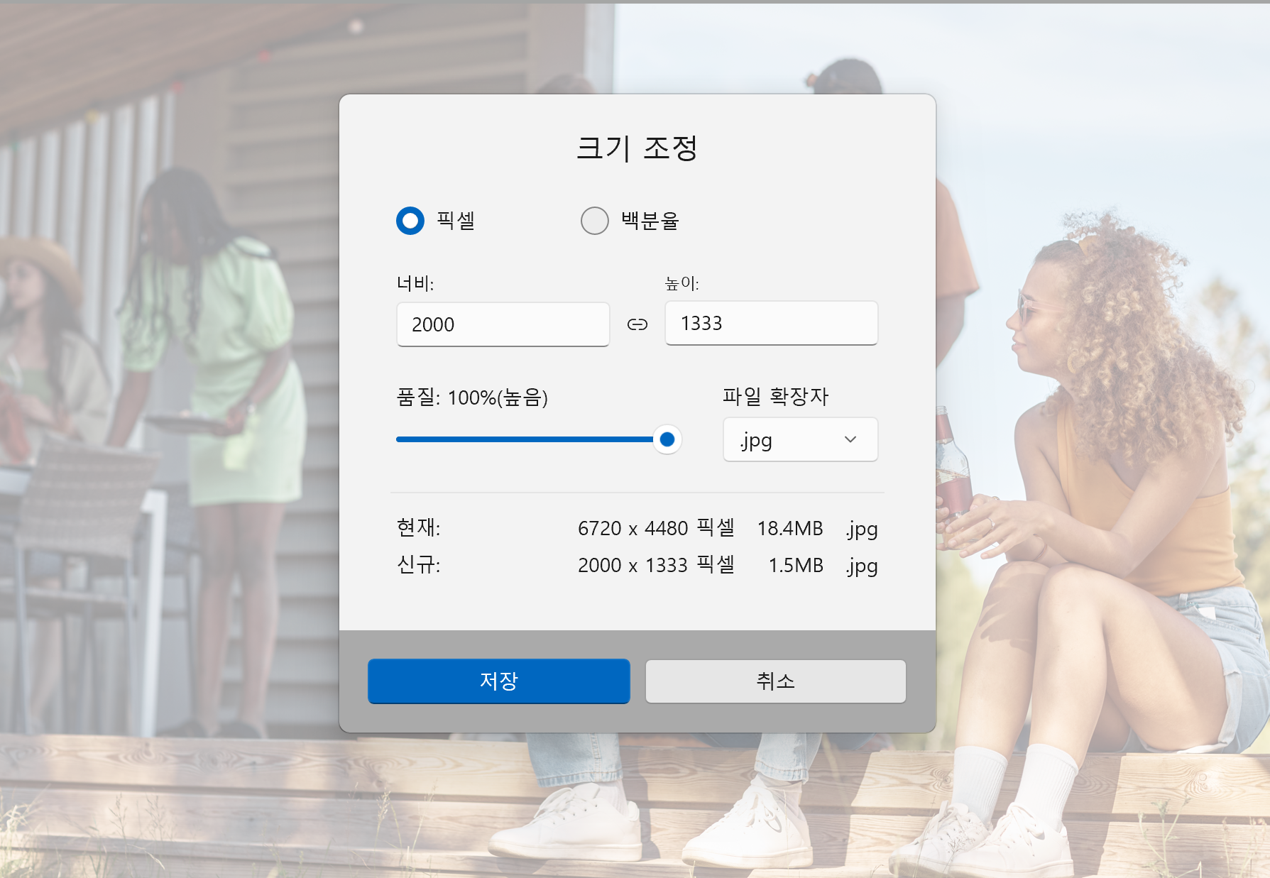윈도우11 사진 크기 조정 창이 등장합니다.