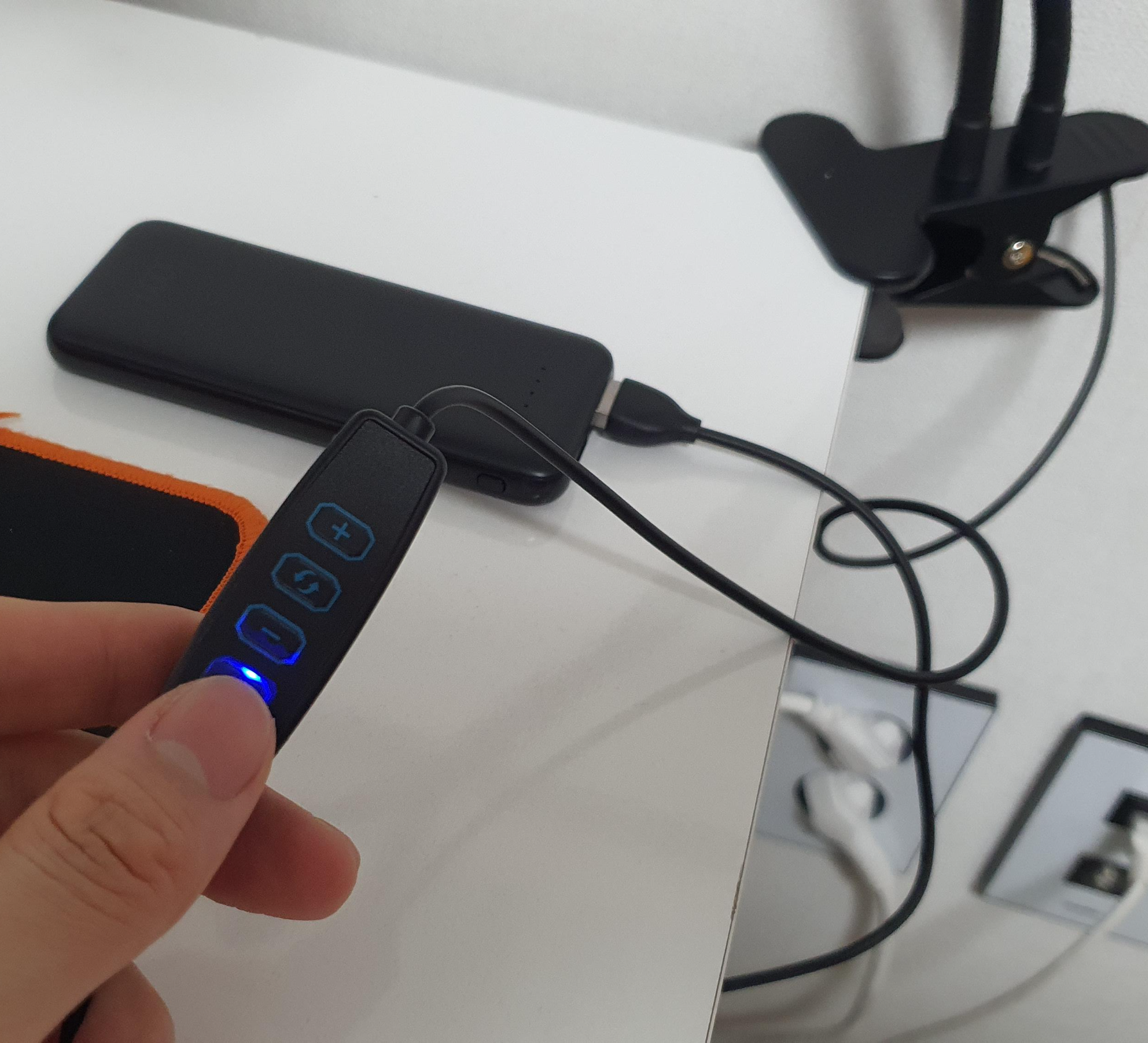 그리고 전원은 휴대용 배터리를 사용하고 있습니다. 본체에 usb 전원 포트가 있고, 그것을 휴대용 배터리에 연결했어요. 일반적인 충전기 usb에 연결하면 사용할 수 있다고 합니다.