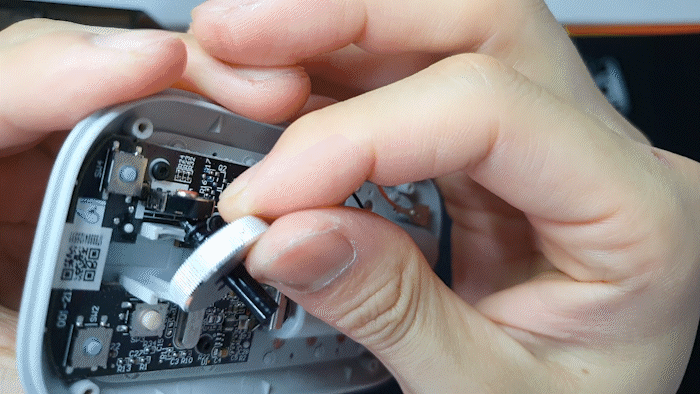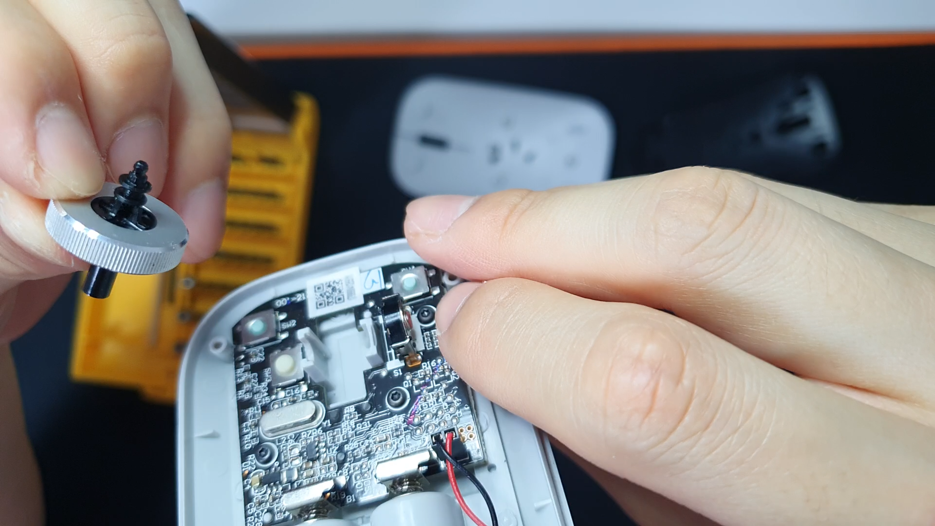 마우스 휠을 결합할 때는 구멍에 먼저 넣어주면서 밀면 결합됩니다.