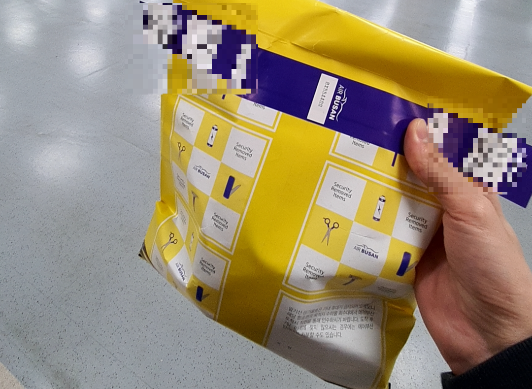 티켓 확인하는 과정에서 잠시 옆으로 물러나서, 승무원 분이 노란봉투에 배터리(+조종기)를 담고 가져갑니다.