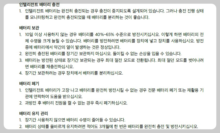 완전히 충전된 배터리를 장기간 보관하지 마십시오. 돌이킬 수 없는 손상을 입을 수 있습니다.