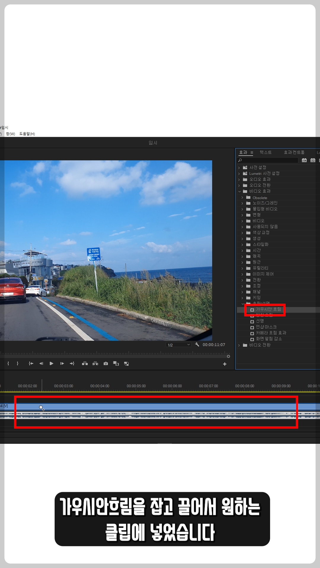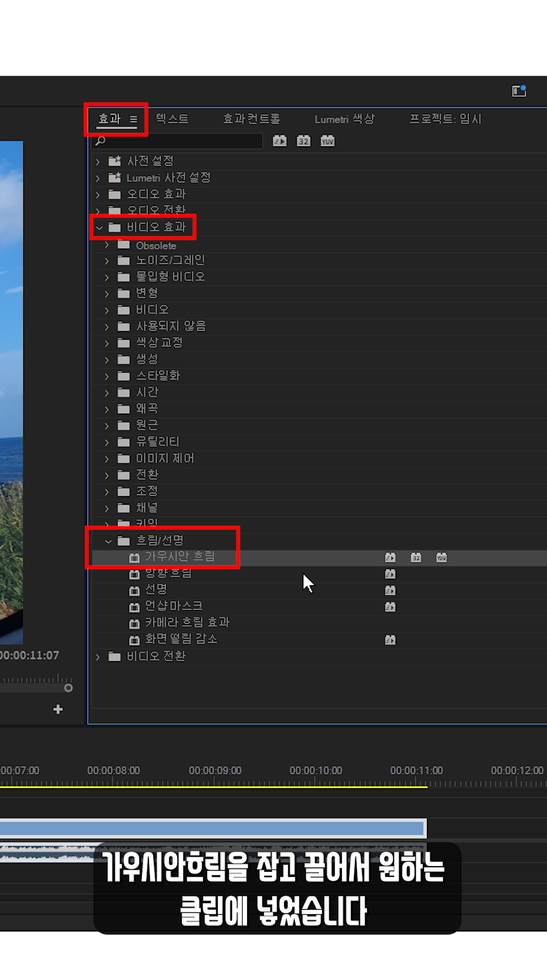 가우시안 흐림을 잡고 끌어서 원하는 클립에 넣습니다.