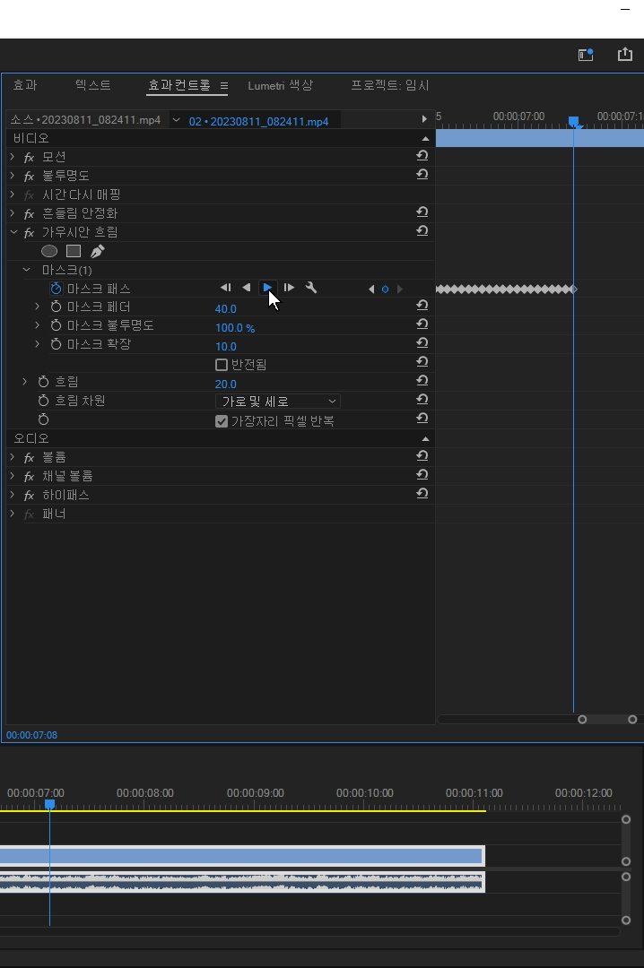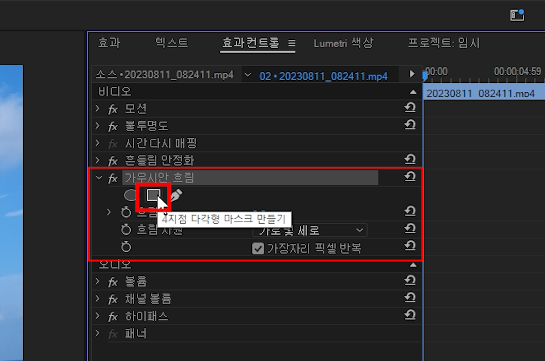 효과 패널 - 비디오 효과 - 흐림/선명 - 가우시안 흐림