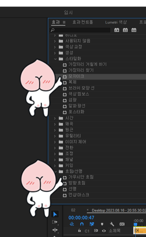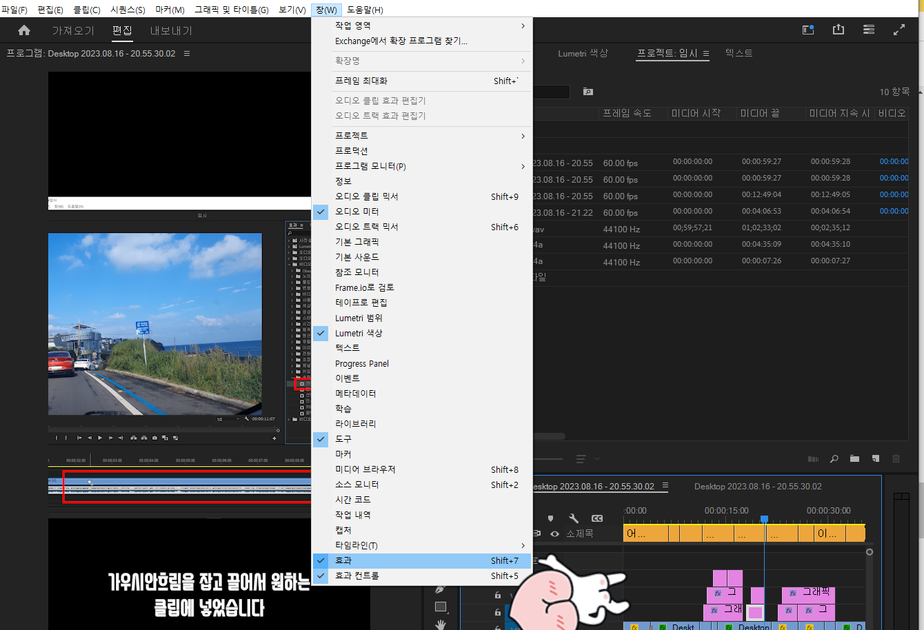만약 효과패널이 보이지 않는다면, 상단 메뉴바 - 창 - 효과(단축키 : shift +7)
