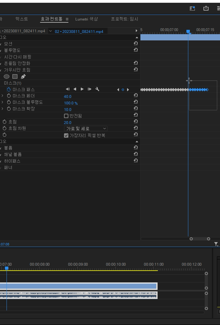 아마도 조만간에 프리미어도 '생성형 효과, 채우기' 기능이 생길거 같은데, 그전까지는 일일이 블러작업 해줍시다(모자이크).