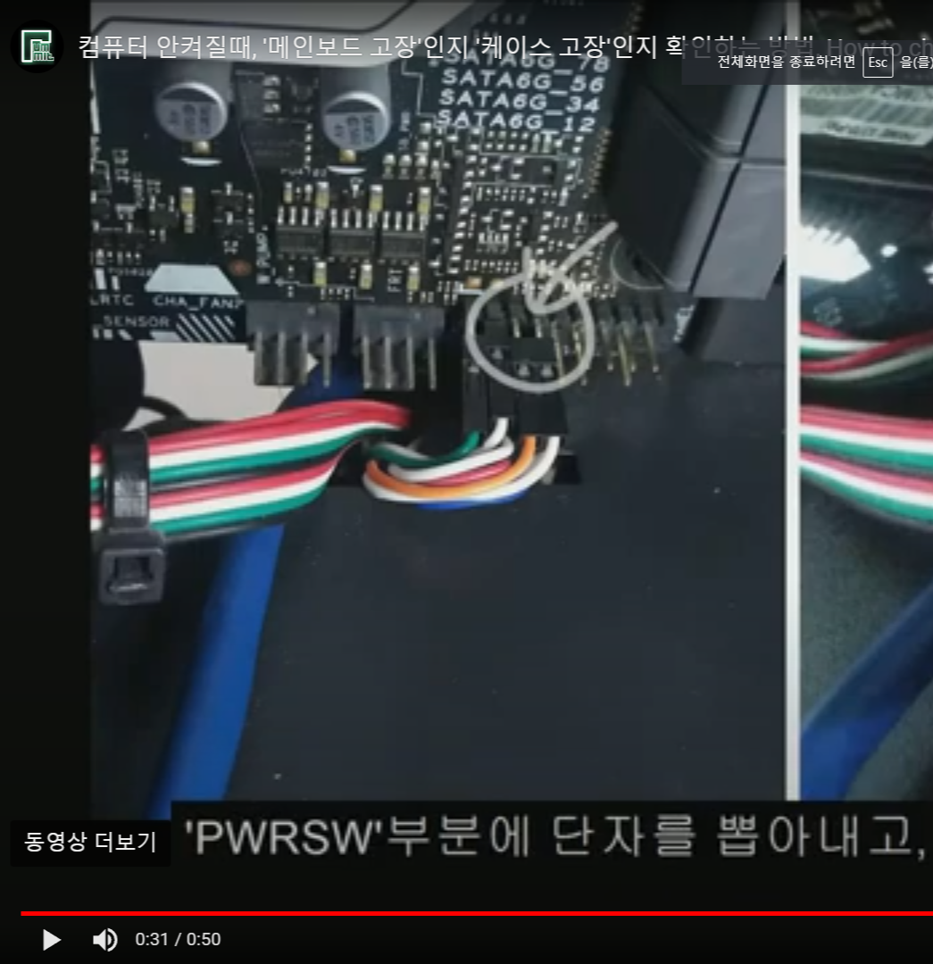 01. 컴퓨터 본체를 열어서, 메인보드의 PWR_SW 부분의 단자를 뽑아냅니다.