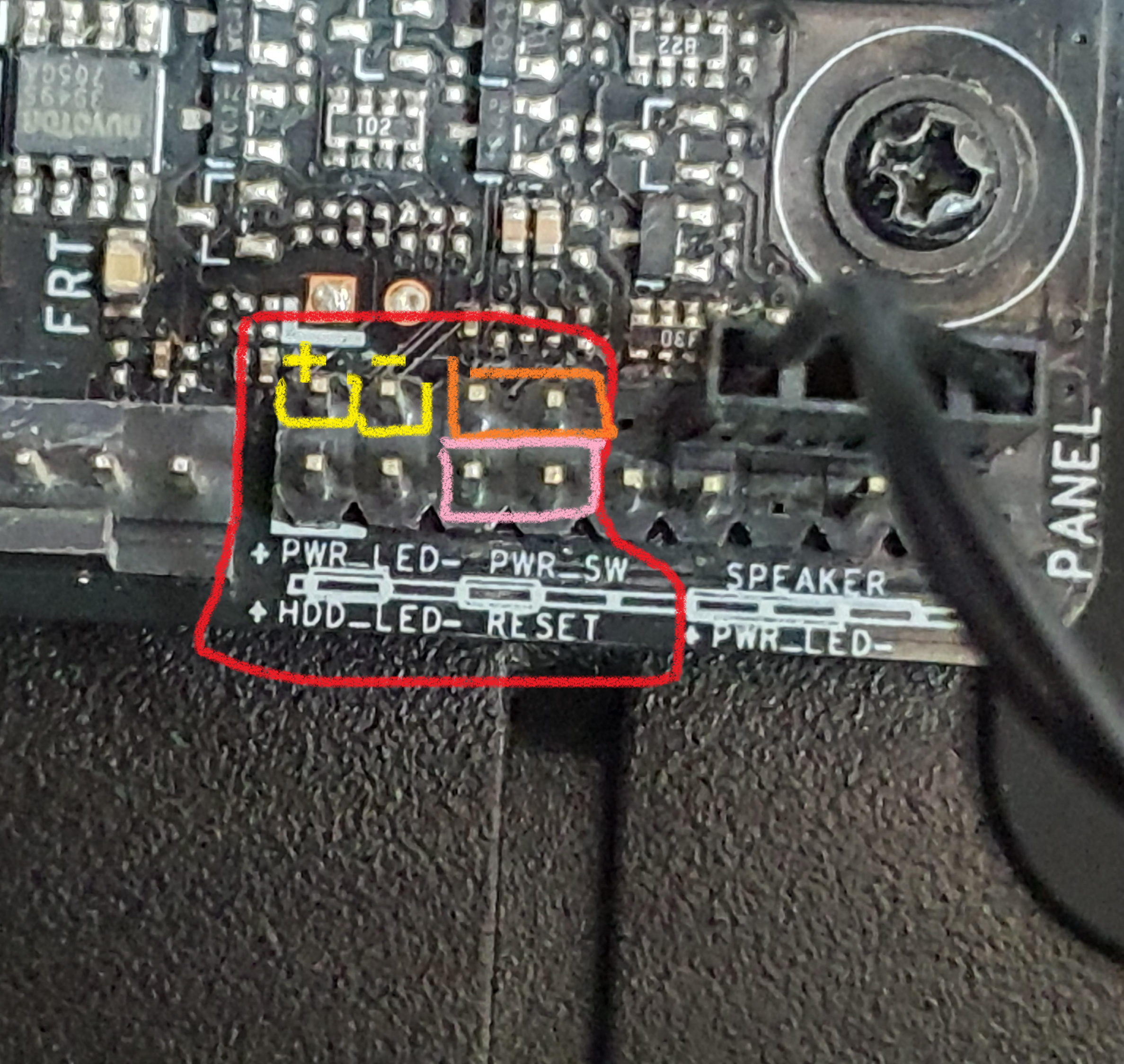 POWER LED 단자는 플러스와 마이너스로 나눠져 있어요. 메인보드에 영어를 확인해 보면 두 번째 부분이 - (마이너스)라고 나와있어요. 노란색으로 표시해 뒀어요.