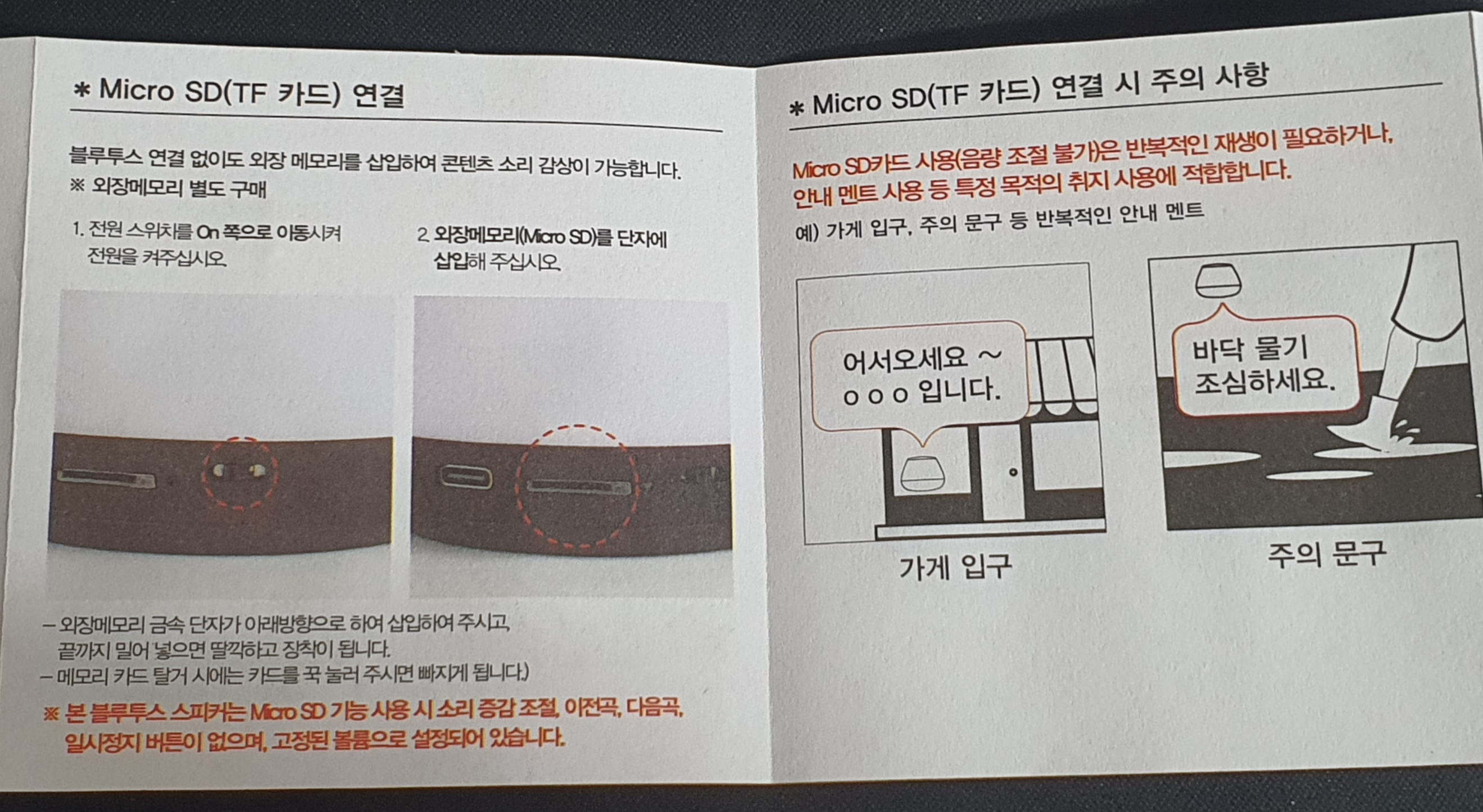 ※ Micro SD카드 사용(음량조절 불가)은 반복적인 재생이 필요하거나, 안내 멘트 사용 등 특정 목적의 취지 사용에 적합합니다.