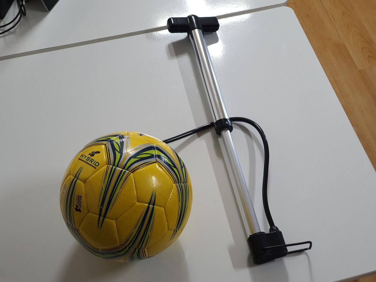 에어펌프(공기주입기)에 '축구공, 농구공'에 바람을 넣는 얇은 노즐을 착용합니다.