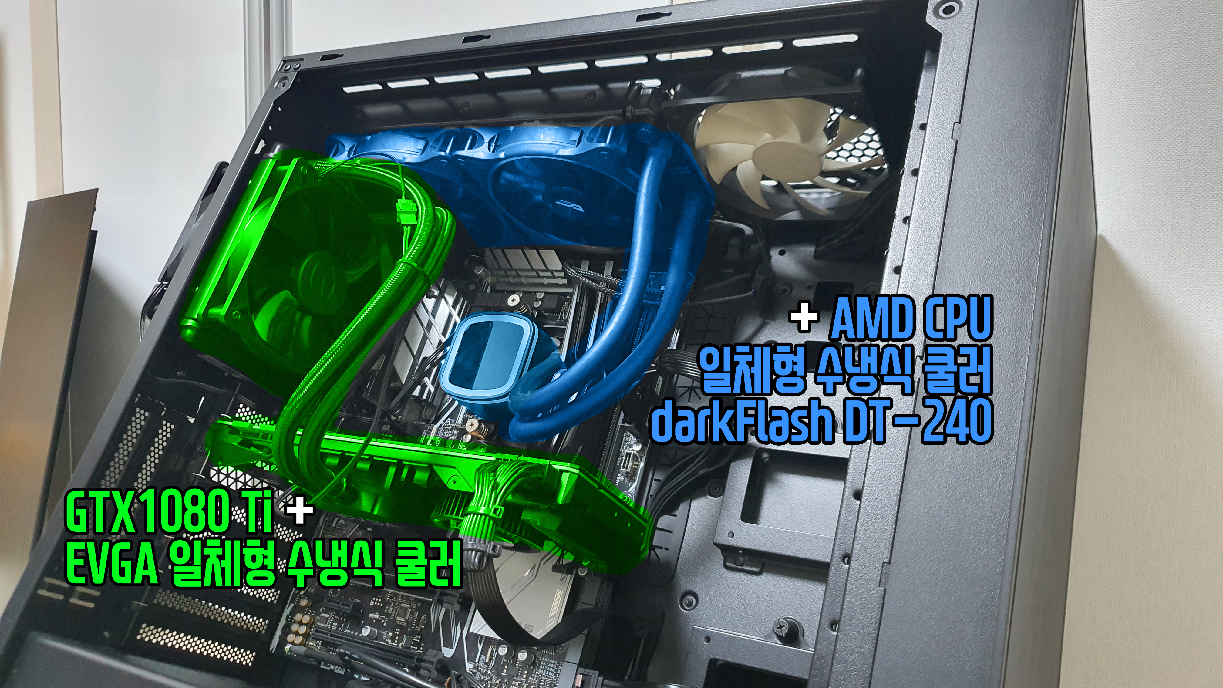 '그래픽카드일체형수냉쿨러 , cpu일체형수랭쿨러' 이렇게 두 개를 본체에 각가 '뒷면, 윗면'에 붙여서 사용 중입니다.