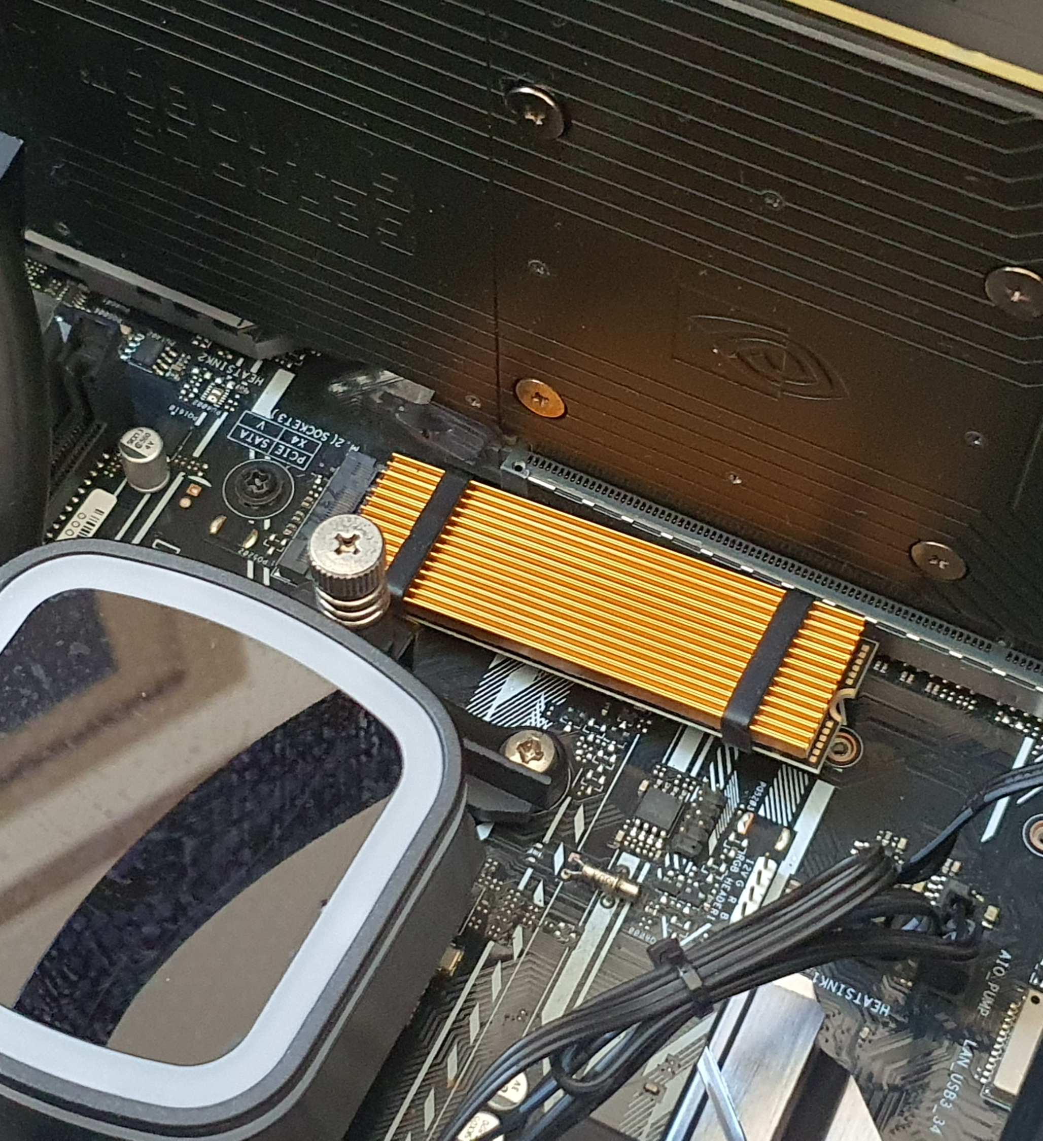 메인보드 가운데, 금색의 M.2 방열판이 빤짝이며 눈에 띄고 있네요.