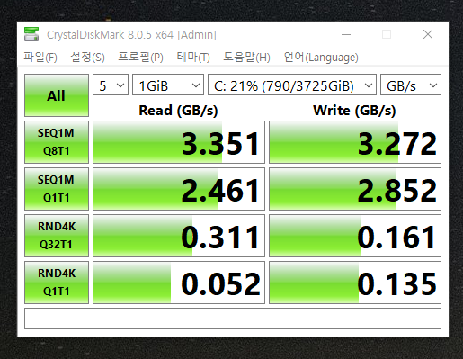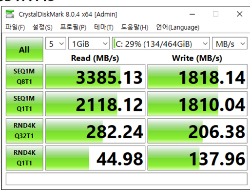 공식 읽기 속도는 4800m/s이라고 합니다. 하지만 실제 속도는 3351m/s 가 나왔어요.