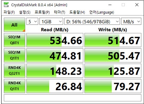 위 이미지는 '마이크론 Crucial MX300 2.5" SATA 1TB' 속도입니다.