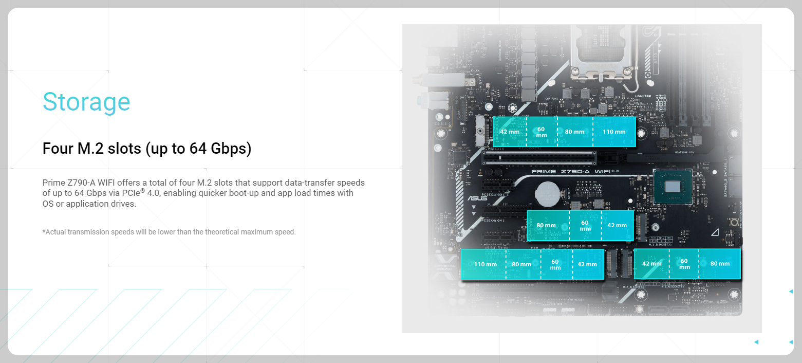 M.2 슬롯, Prime Z790-A WIFI는 PCIe® 4.0을 통해 최대 64Gbps의 데이터 전송 속도를 지원하는 총 4개의 M.2 슬롯을 제공하여 부팅 및 앱 로드 시간을 단축합니다. OS 또는 애플리케이션 드라이브를 사용합니다. *실제 전송 속도는 이론상 최대 속도보다 낮습니다.