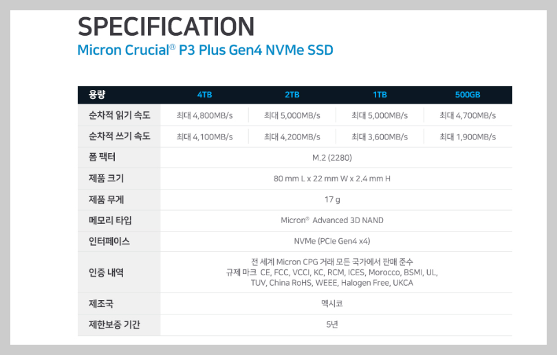 그래서 '마이크론 Crucial P3 Plus M.2 2280 NVMe SSD 4TB' 제품을 구입했어요.