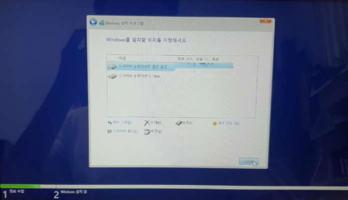 위 상황에서 윈도우즈 설치 할 때 강제로 파티션이 나뉘어요.