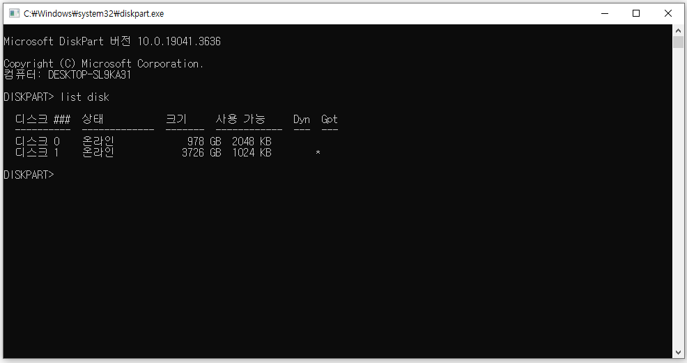 변경을 원하는 드라이브의 숫자를 확인하고 'select disk 1' (해당 디스크 숫자) 명령합니다.