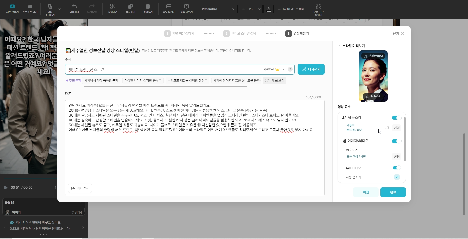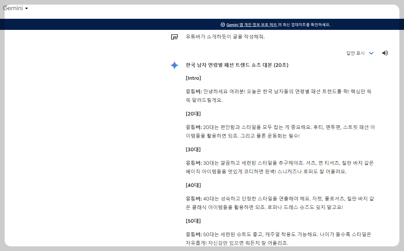 대화형 AI가 작성해 준 [한국 남성 패션 트렌드] 시나리오(대본, 텍스트)를 붙여 넣기 합니다(글을 좀 다듬어줍니다).