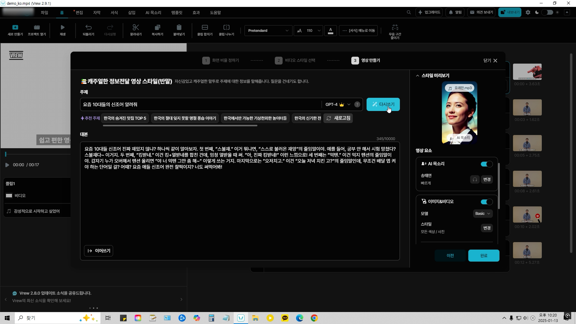 이 상태에서, AI가 만들어준 영상을 보면서 어색한 부분을 수정해서 영상을 완성하면 됩니다.