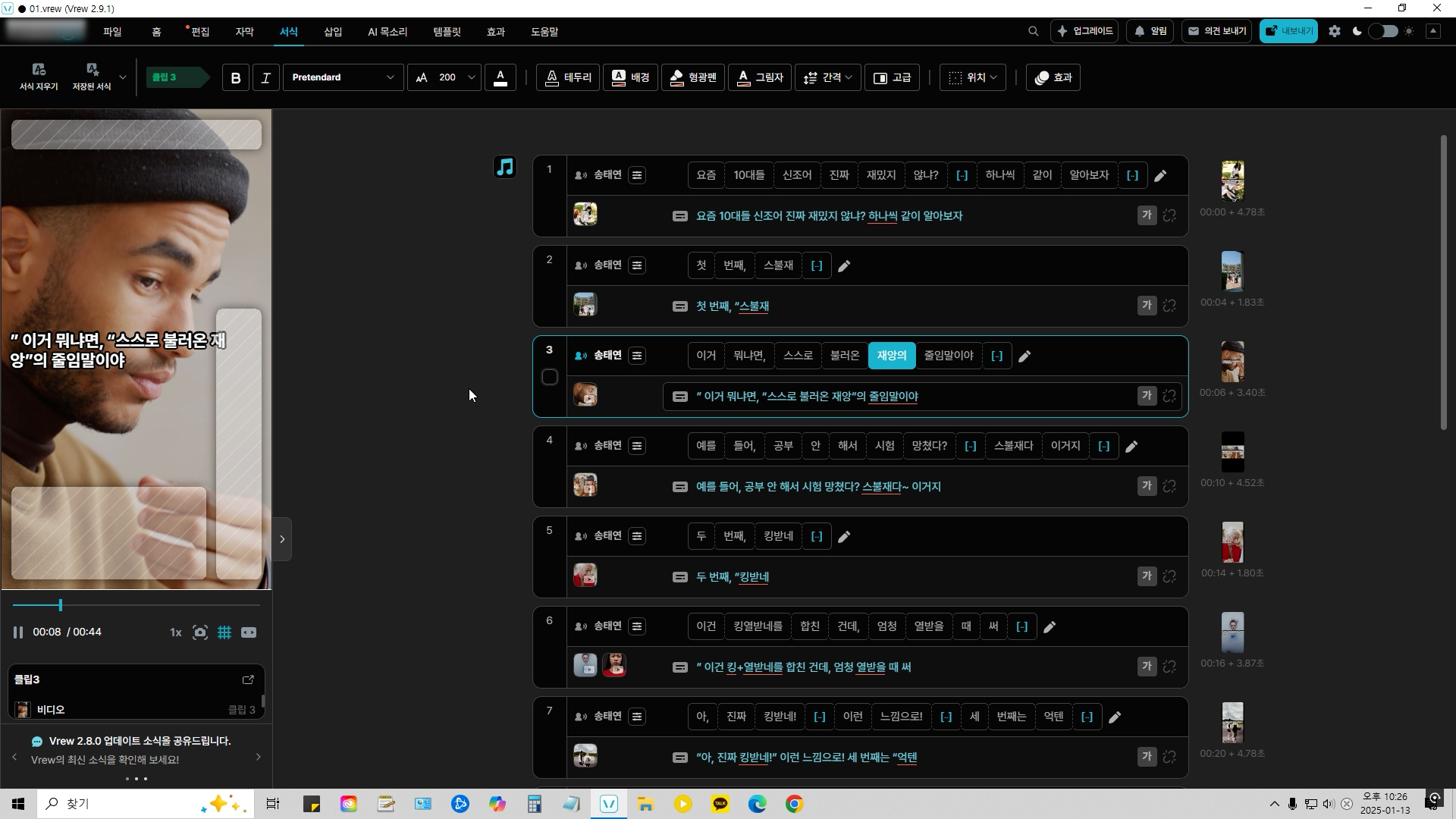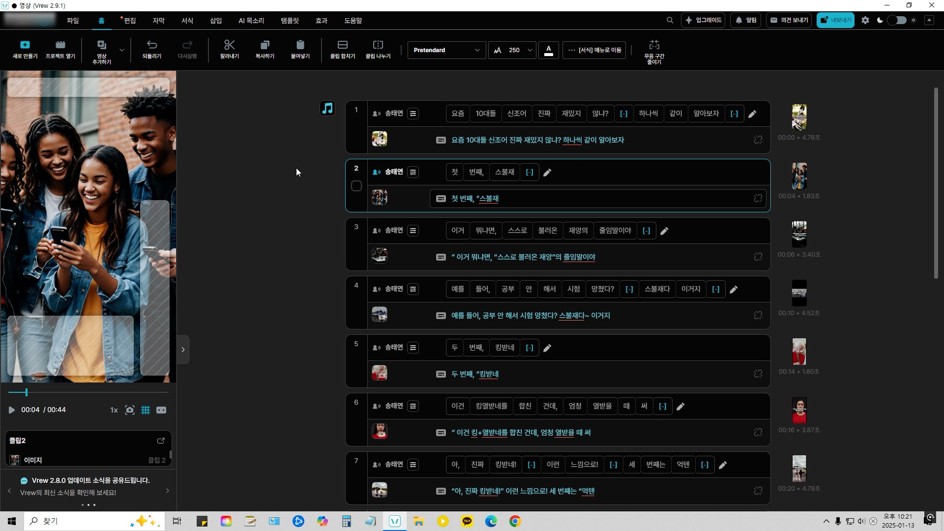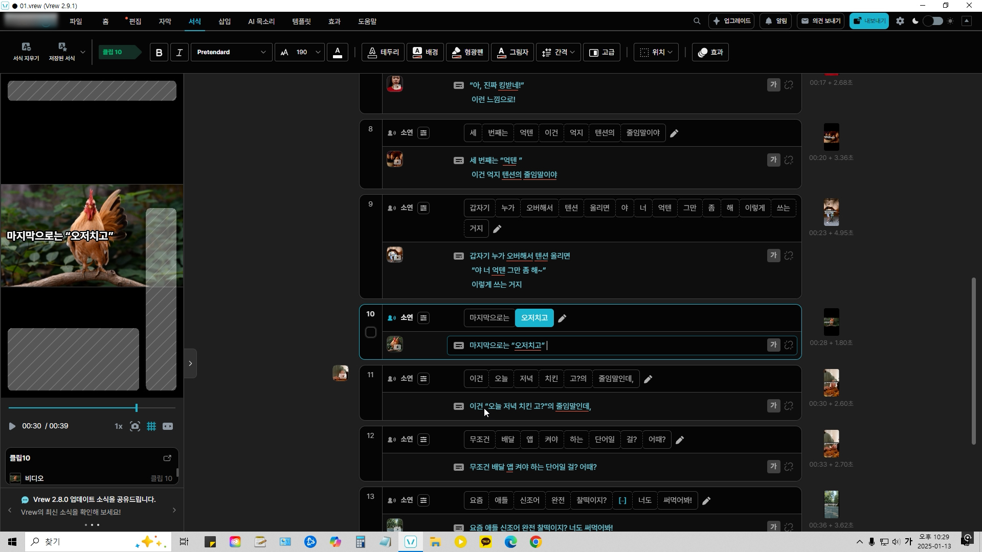 이제 내레이션 타이밍이나 자막 폰트 등을 수정해서 영상을 완성하면 됩니다.