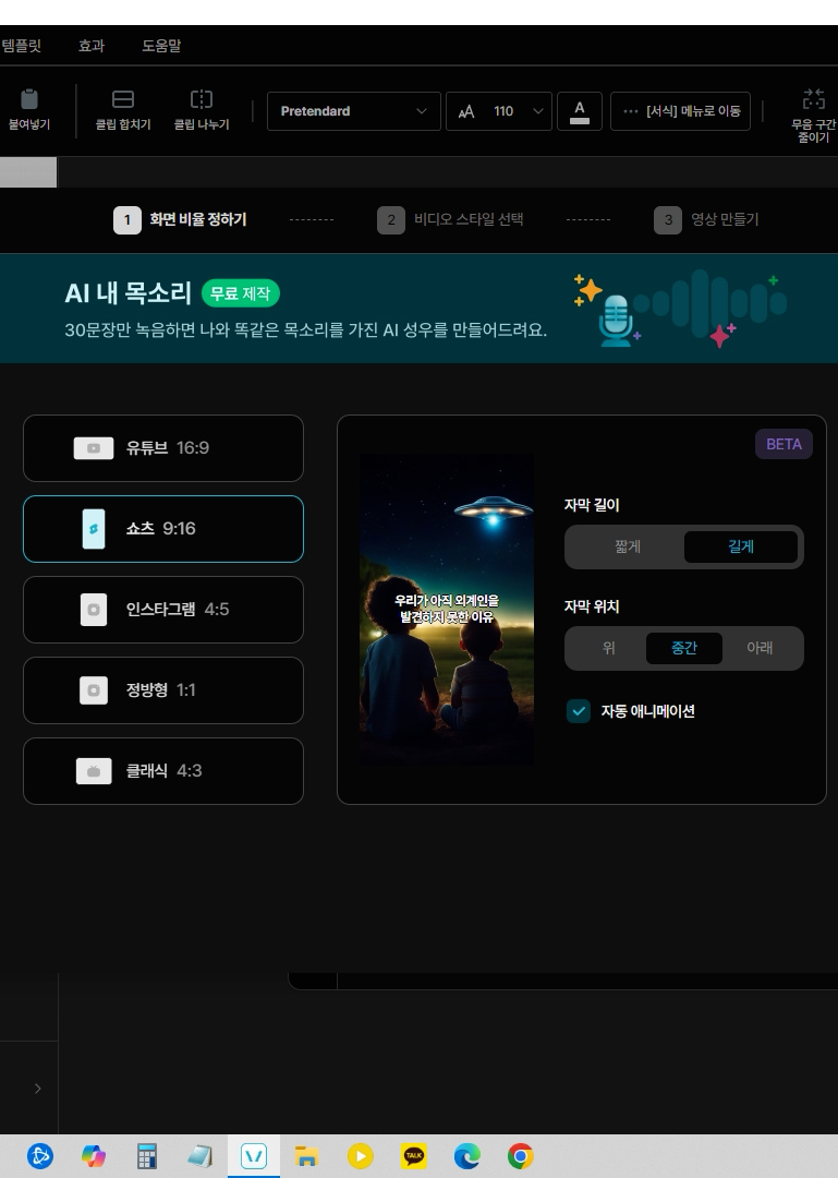 '쇼츠, 자막길이 길게, 자막위치 중간' 이렇게 선택했어요.