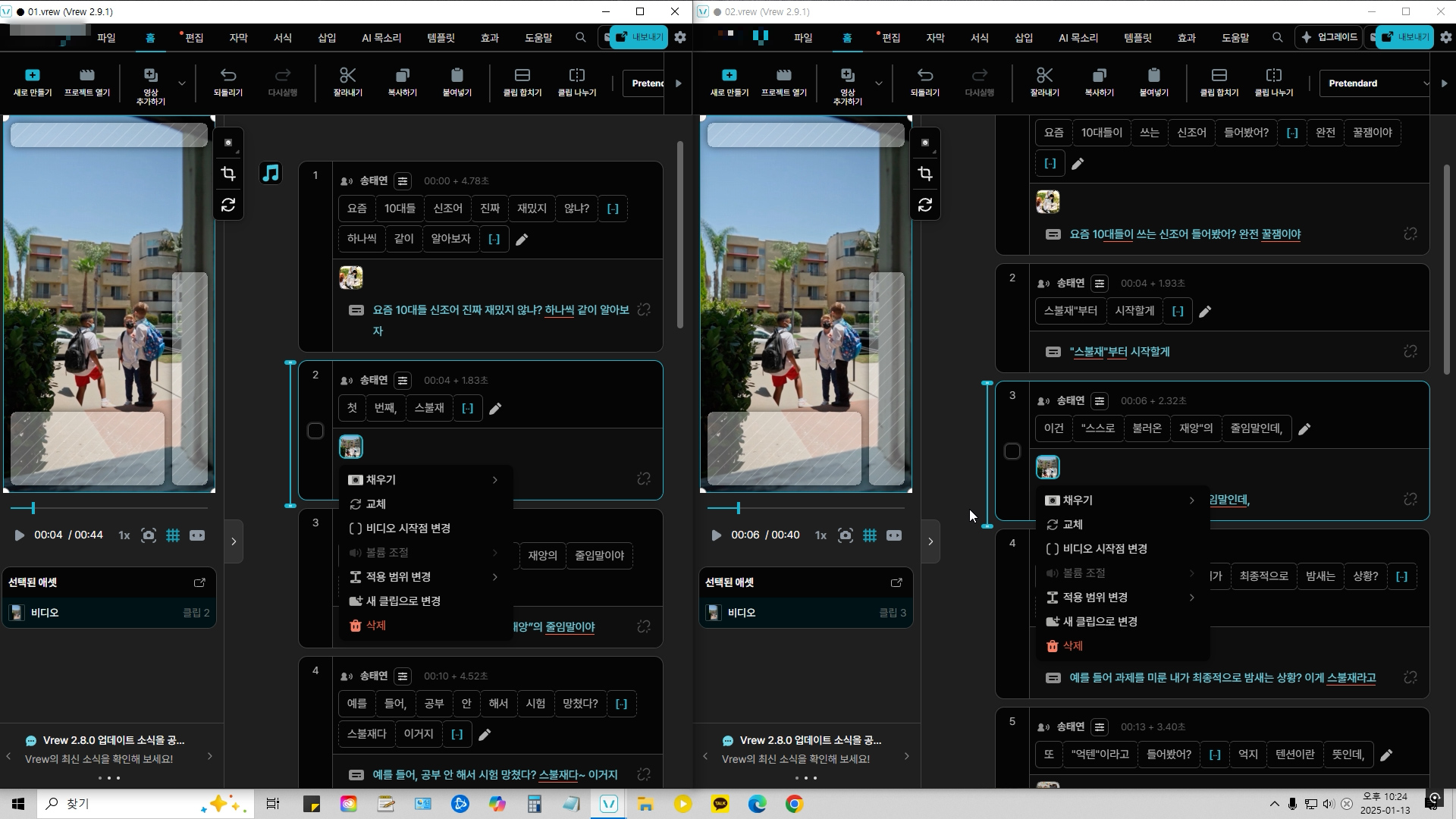 두 가지 버전을 보면서 , 대본과 어울리는 영상(이미지)을 골라서 남겨주고, 나머지는 지워줍니다.