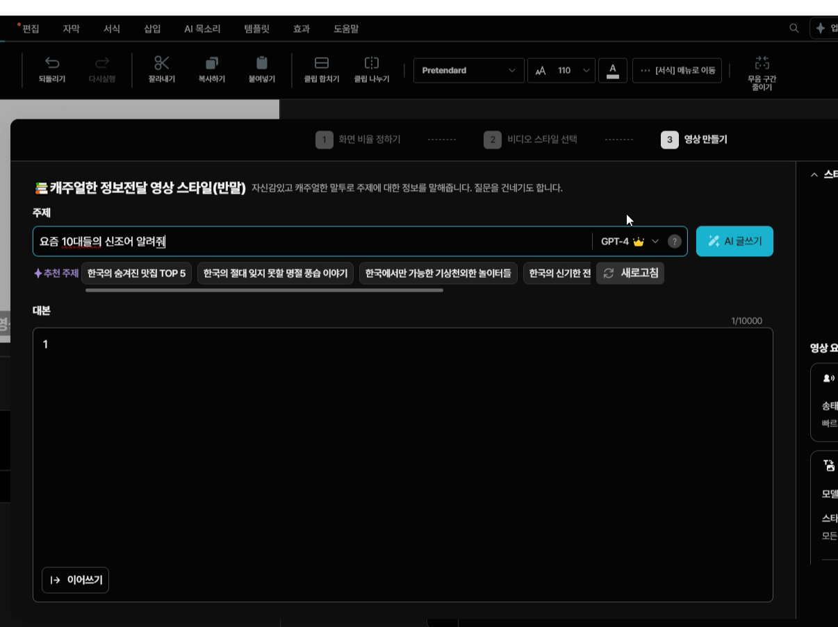 영상의 주제를 작성하면 'AI, GPT-4'를 사용해서, 알아서 대본을 만들어 줍니다.