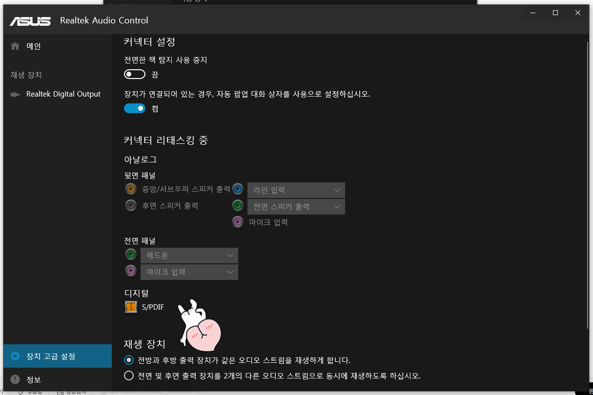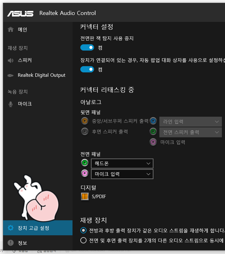 만약 위쪽에 '전면판 잭 탐지 사용 중지'가 작동중인데 불구하고 소리가 나오지 않는다면,