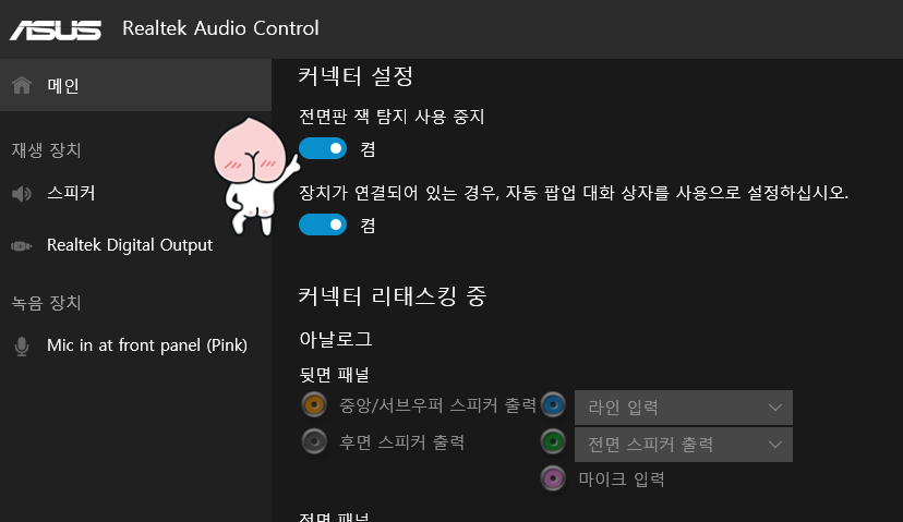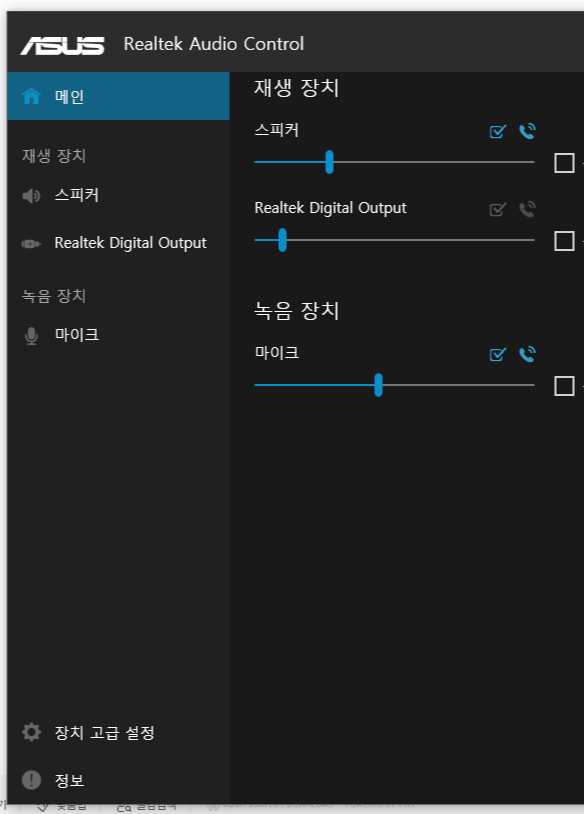 Realtek Audio Control(리얼텍 오디오 컨트롤)을 실행하면 메인화면이 등장합니다.