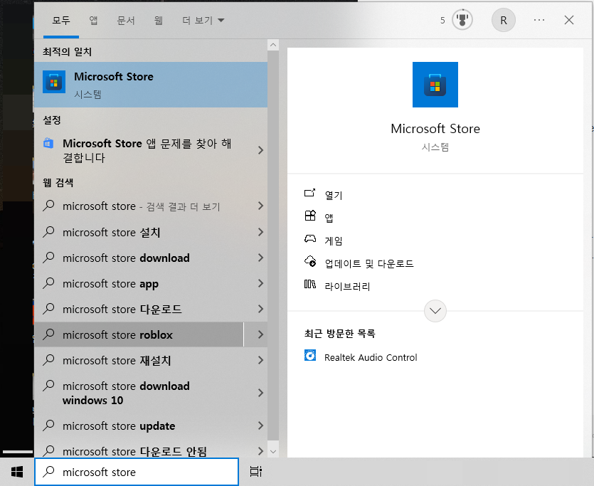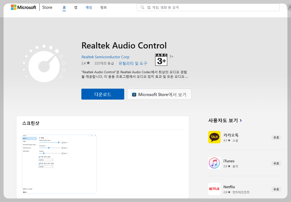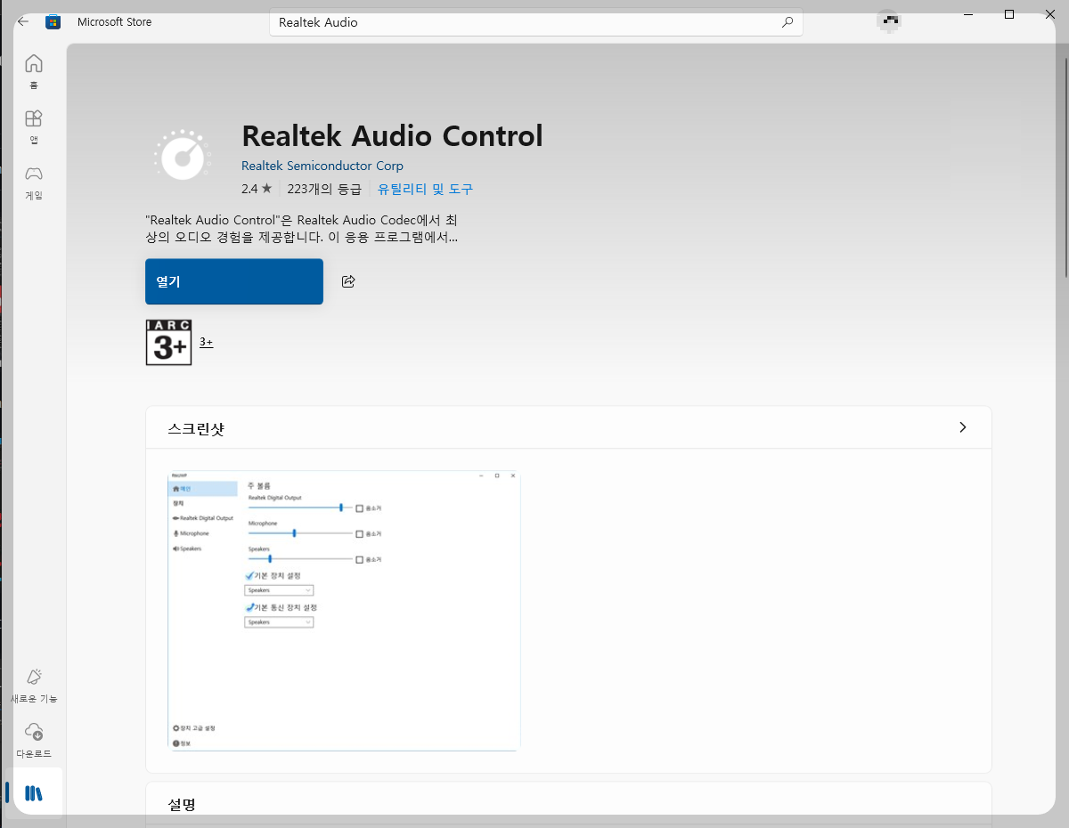 '마이크로소프트 스토어(microsoft store)'에서 'Realtek Audio Control'를 검색해서 설치합니다.
