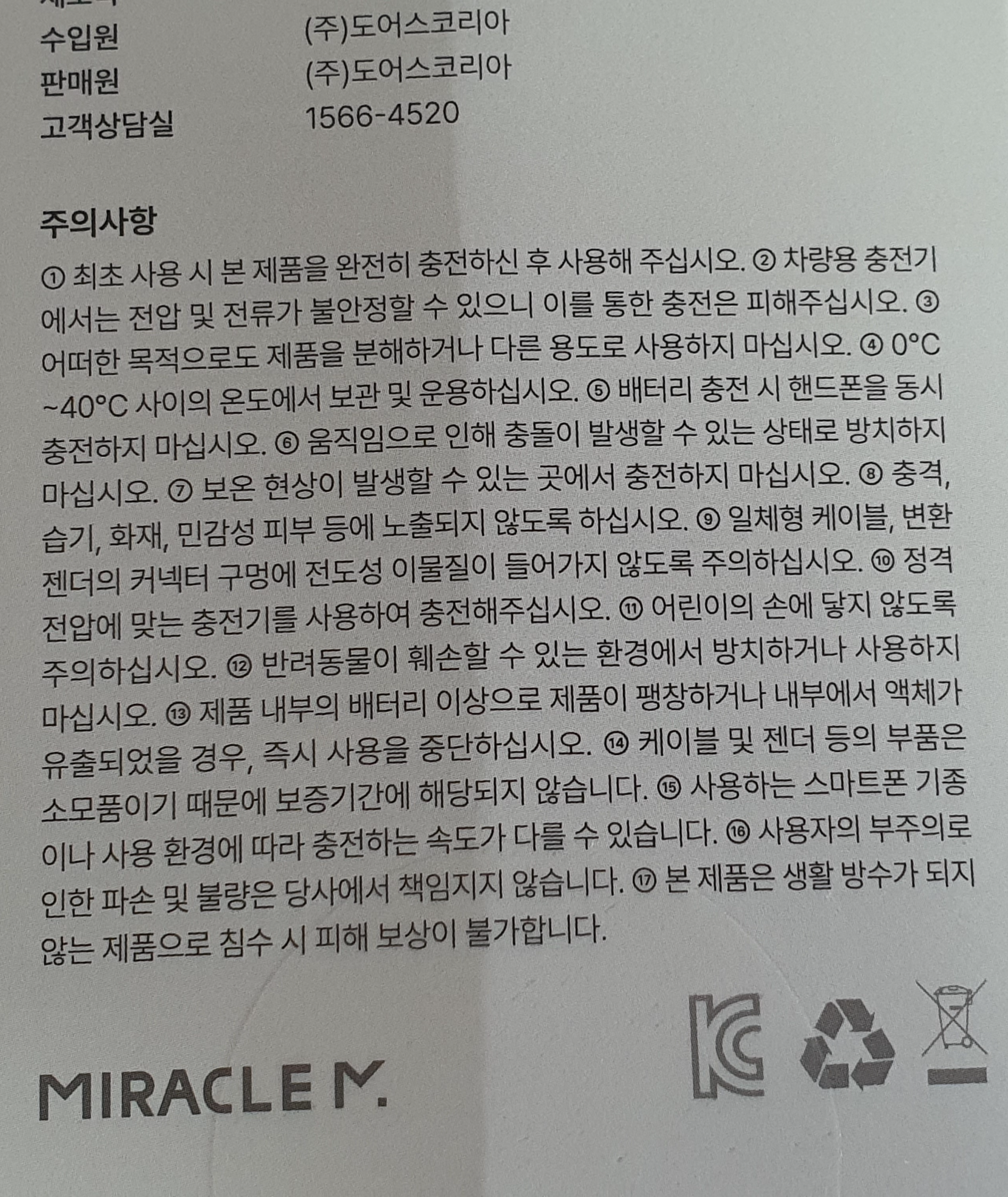 1 최초 사용 시 본 제품을 완전히 충전하신 후 사용해 주십시오. 2 차량용 충전기에서는 전압 및 전류가 불안정할 수 있으니 이를 통한 충전은 피해 주십시오. 3 어떠한 목적으로도 제품을 분해하거나 다른 용도로 사용하지 마십시오. 4 OC ~40°C 사이의 온도에서 보관 및 운용하십시오. 5 배터리 충전 시 핸드폰을 동시 충전하지 마십시오. 6 움직임으로 인해 충돌이 발생할 수 있는 상태로 방치하지 마십시오. 7 보온 현상이 발생할 수 있는 곳에서 충전하지 마십시오. 8 충격, 습기, 화재, 민감성 피부 등에 노출되지 않도록 하십시오. 9 일체형 케이블, 변환 젠더의 커넥터 구멍에 전도성 이물질이 들어가지 않도록 주의하십시오. 10 정격 전압에 맞는 충전기를 사용하여 충전해 주십시오. 11 어린이의 손에 닿지 않도록 주의하십시오. 12 반려동물이 훼손할 수 있는 환경에서 방치하거나 사용하지 마십시오. 13 제품 내부의 배터리 이상으로 제품이 팽창하거나 내부에서 액체가 유출되었을 경우, 즉시 사용을 중단하십시오. 14 케이블 및 젠더 등의 부품은 소모품이기 때문에 보증기간에 해당되지 않습니다. 15 사용하는 스마트폰 기종이나 사용 환경에 따라 충전하는 속도가 다를 수 있습니다. 16 사용자의 부주의로 인한 파손 및 불량은 당사에서 책임지지 않습니다. 17 본 제품은 생활 방수가 되지 않는 제품으로 침수 시 피해 보상이 불가합니다.