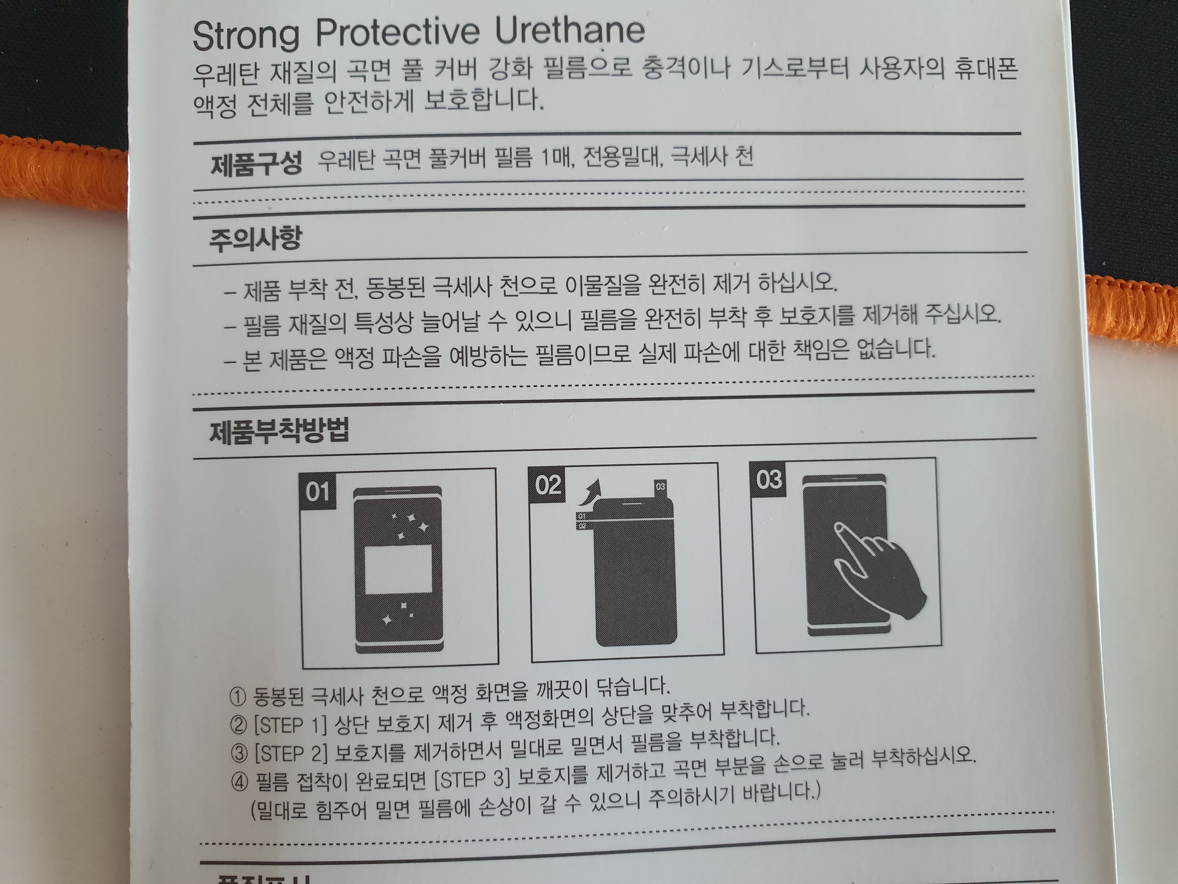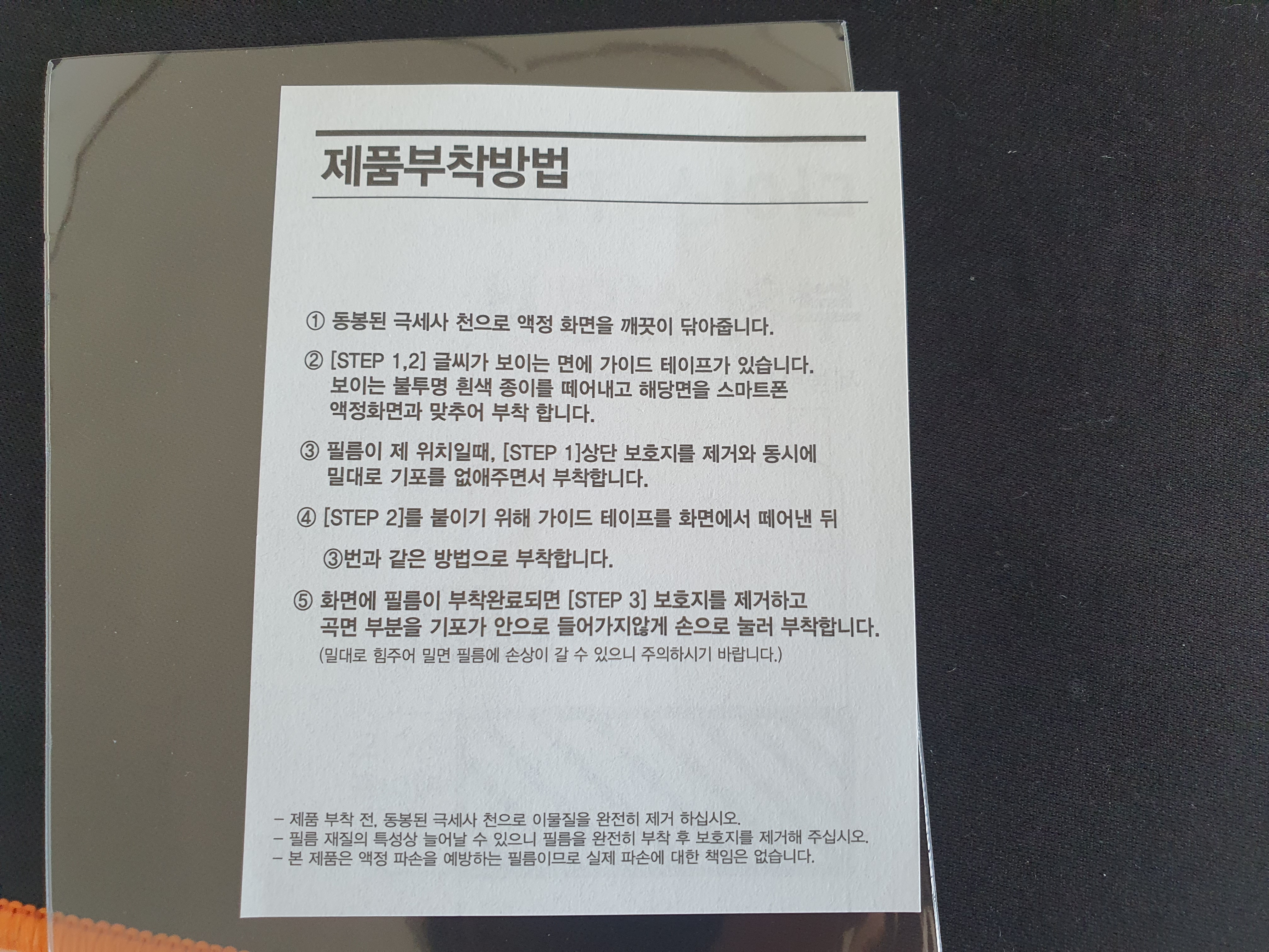 주의사항. 제품 부착 전, 동봉된 극세사 천으로 이물질을 완전히 제거 하십시오. 필름 특성상 늘어날 수 있으니 필름을 완전히 부착 후 보호지를 제거해 주십시오. 본 제품은 액정 파손을 예방하는 필름이므로 파손에 대한 책임은 없습니다.