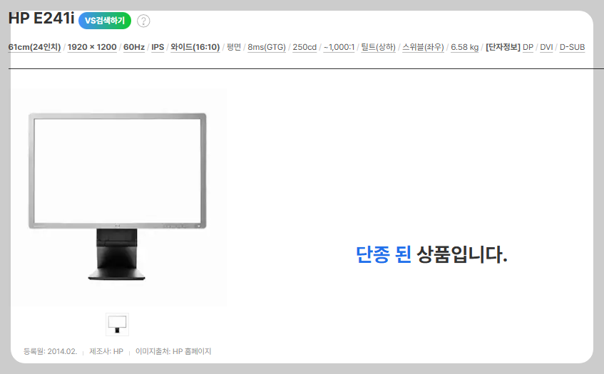 사용하는 모니터 기종은 HP의 EliteDisplay E241i 모니터로 2014년도에 출시 된 제품이네요.