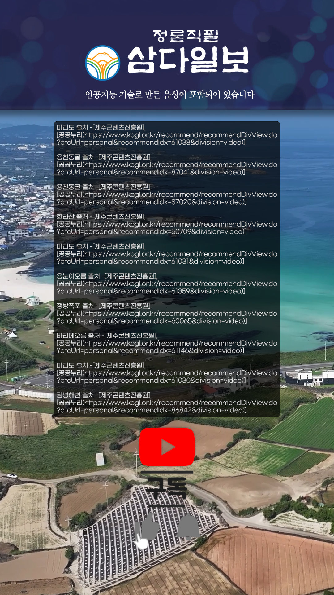 제주 자연경관 고화질 영상 사용 방법! 무료 다운로드에 상업적 이용까지( 삼다일보, 2025.12.09 ) , 제주 자연경관 고해상도 영상 무료 개방( 삼다일보, 2025.10.26 ) , 주 자연 경관 영상 무료다운 사용방법, 상업적 이용! 드론 항공 촬영 공공누리 출처 사용법, Free download: Jeju scenery videos, commercial ( 삼다일보 유튜브 )