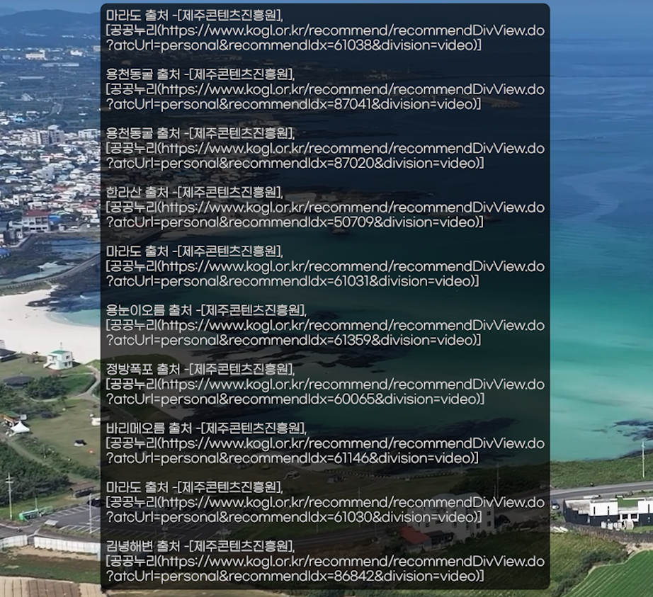 위 영상과 아래 이미지 모두 '제주콘텐츠진흥원'에서 제공하는 제주 자연 경관 영상 모습입니다.