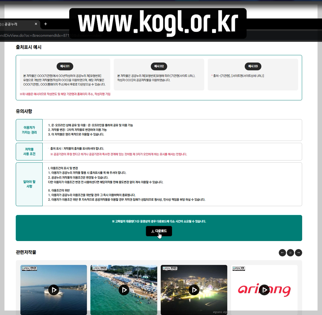 위의 각 공공기관에서 미디어 자료를 공공누리로 모아두어서, 쉽게 검색하고 다운 받을 수 있습니다.